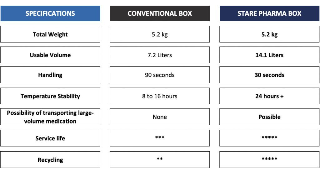 La Stare® Box, desarrollada, fabricada y patentada internacionalmente por MSI Tech, está diseñada para optimizar los soportes de carga, ofreciendo una excepcional facilidad de manejo y logística. Las mercancías sensibles a la temperatura pueden transportarse entre -75 °C y +55 °C en distancias medias y cortas utilizando vehículos sin refrigeración activa.
